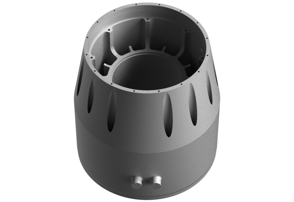 KW Micro Power公司的机载微型涡轮机的一个关键部件是发电机外壳。KW Micro Power、nTopology和VELO3D的工程师设计了一种外壳,它不仅比原始设计轻得多,而且具有最小的支撑结构,可以作为一个整体制造,而且具有内部保形通道,用于冷却发动机和预热燃料。