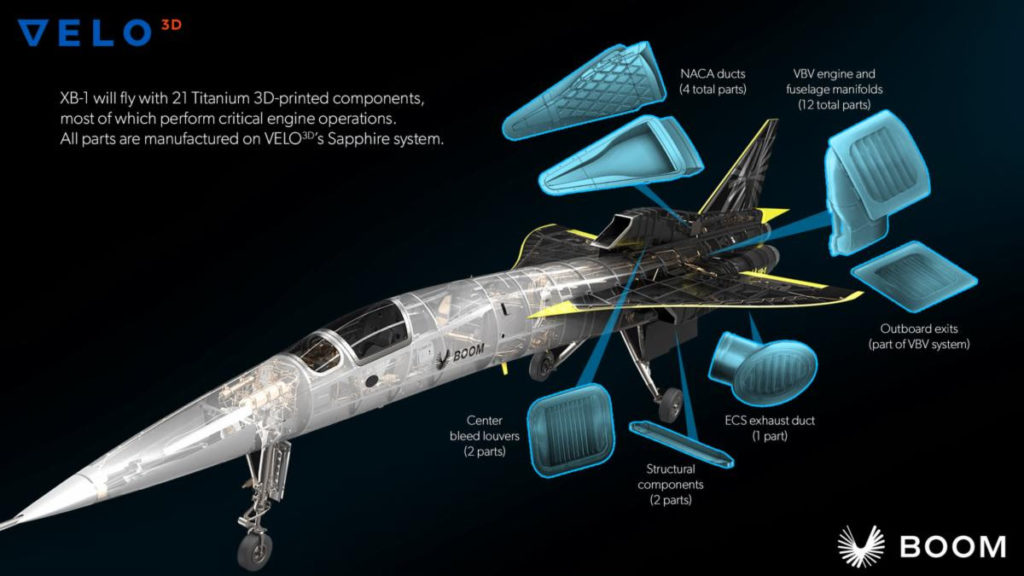 Boom超音速团队选择了Velo3D的激光粉末床熔合(LPBF)技术,在飞机的关键区域生产了大量的钛打印部件(其中许多部件有一个右版本和一个左版本)。这些包括可变旁通阀(VBV)系统的歧管,该系统将发动机压气机释放的空气输送到飞机的外模线(OML);用于冷却座舱和系统舱的环境控制系统(ECS)的出口百叶窗;将中心入口的二次排流导向OML的百叶窗;和NACA管道和两个转向器法兰部件。NACA管道经常用于高速飞机捕获外部空气,并将其引入飞机冷却发动机舱。所有零件都印在VELO上3 d蓝宝石系统。