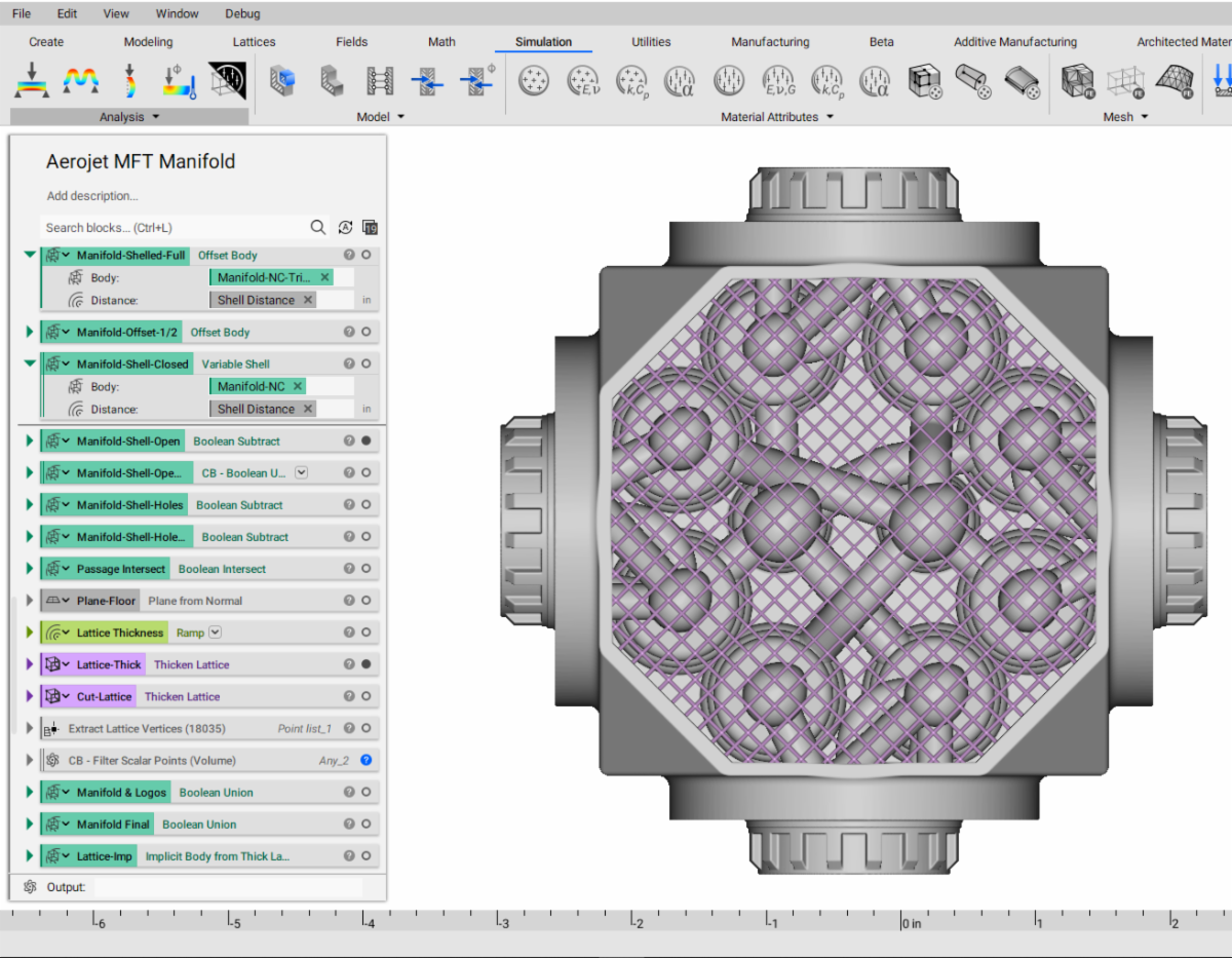 来自纽约工程和设计软件公司nTopology的技术人员很快就能够“剥离”注入器本体的块状结构,在复杂的流体端口和通道周围保留一致的壁厚,同时消除应力集中区域。然后,他们用薄的晶格结构填充产生的空洞,增加其强度和刚度,同时只增加最小的重量;由于其“隐式建模”功能,nTopology能够将四柱注入器的质量减半。