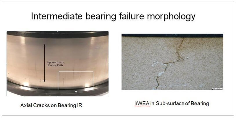 The image on the right shows a cross-section through the bearing ring. This shows what’s called an irWEA or an irregular white etch area. This is a tell tale structure associated with this white etch crack failure.