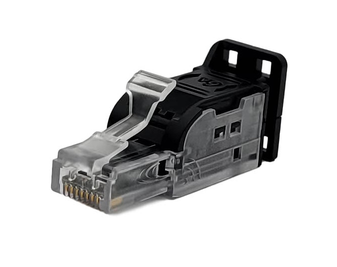 Additional specifications and features include: Cat6A certified for Patch and Permanent Link; Unshielded twisted pair; IDC Terminal style contacts for a wide range of conductor sizes; Cable tie included for securing cable jacket; UL 94V0-rated housing; Phosphor bronze contacts with 60u” nickel coating and 50u” gold plating; Operating temp -10 C – 60 C;