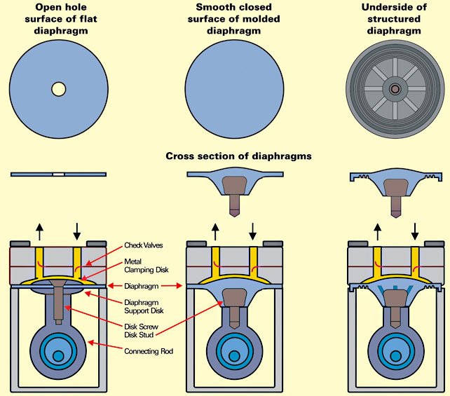 在这个工程图中显示了三种类型的隔膜。平膜片(左)是最简单、最便宜的。结构隔膜泵,右,更小,更强,泄漏率低至1%的简单单位与平面隔膜。