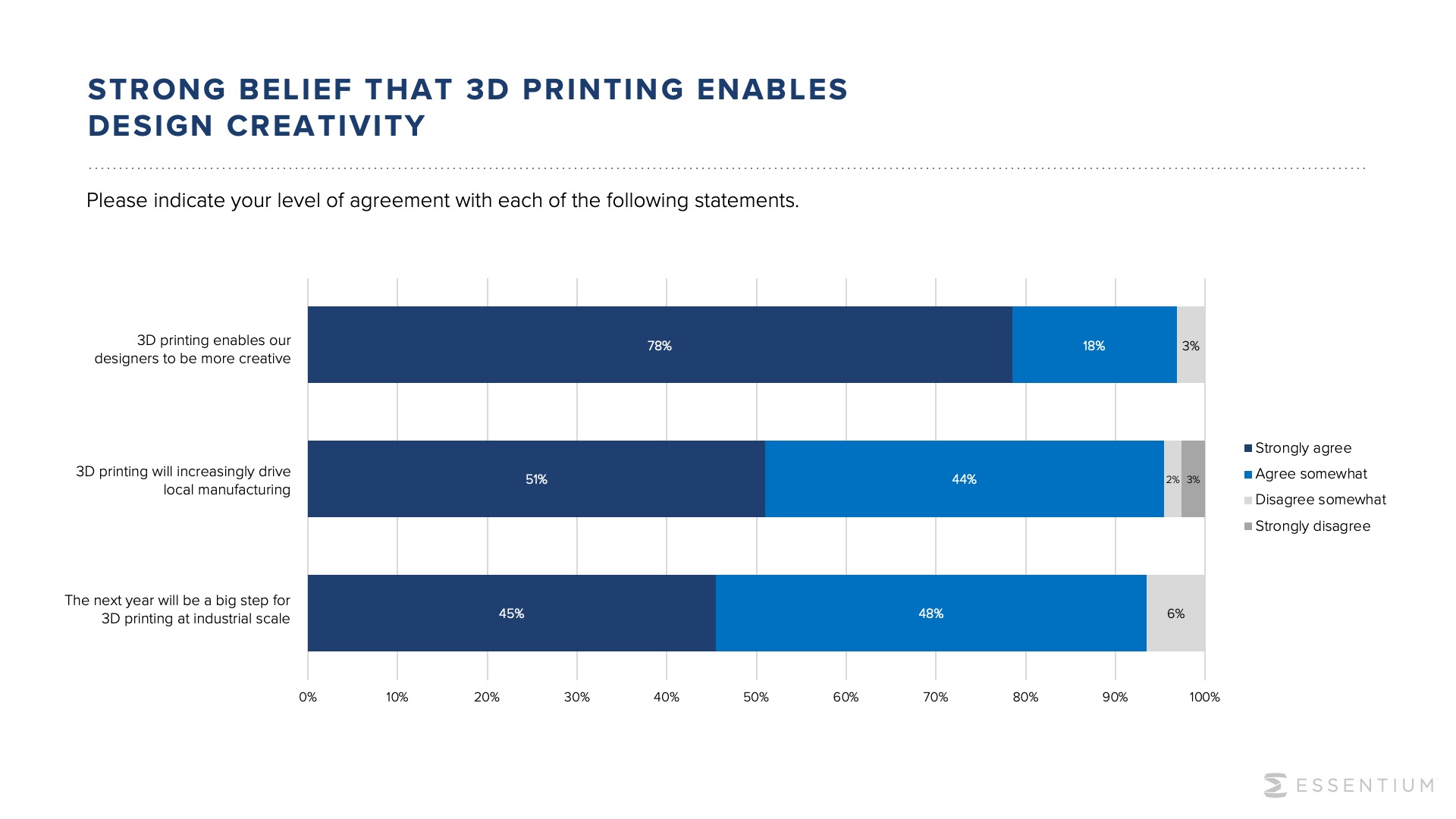 研究表明,3D打印技术使设计师能够发明新的方法,在生产线的多个点上制造零件,包括制造工具、夹具、夹具、配合测试和最终使用零件。大多数(97%)的受访者表示,3D打印让他们的设计师更有创造力。