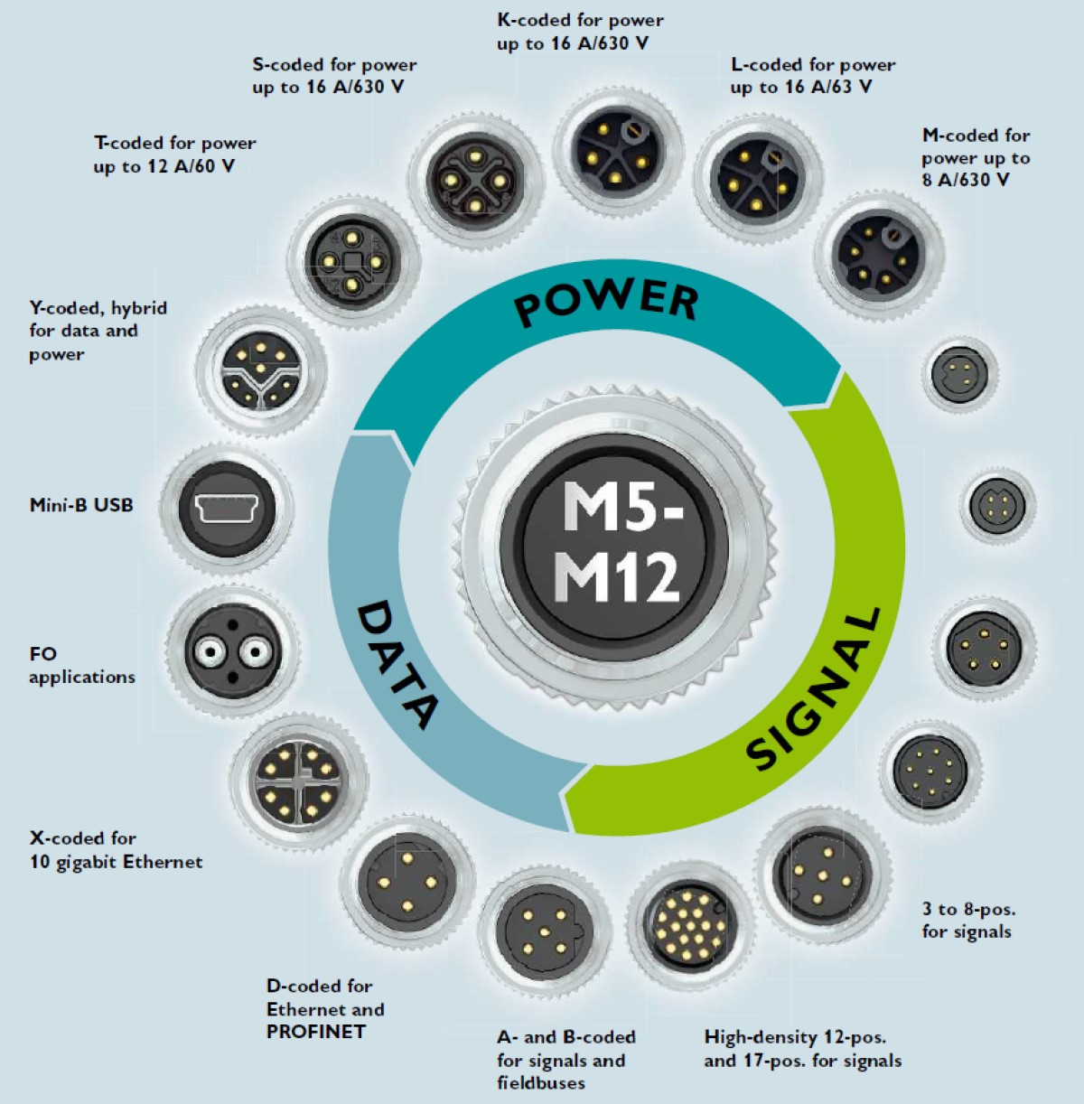 M12连接器用于许多自动化应用程序,并提供多种编码风格以防止错配。IP等级从防尘和防水IP 65到IP 68不等,可防止完全和持续浸没在水中。五种常见类型的M12连接器编码包括: