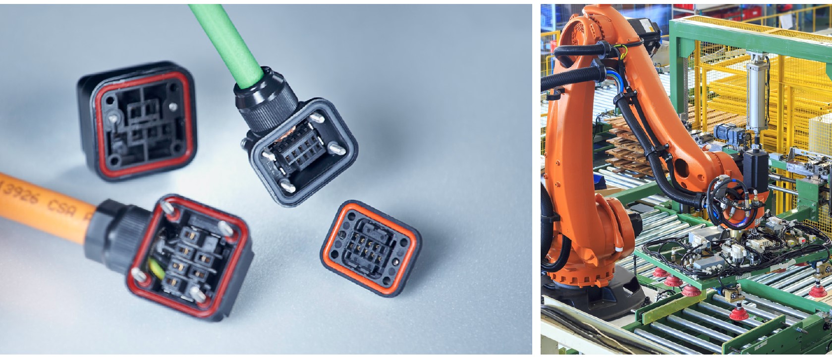 甚至更小,在另一个极端,大型模块化重型连接器可以提供数十条信号线和光通信、气动连接和电力输送,是针对中小型机器人电机驱动和控制优化的微型连接器(图4)。小型电机驱动和控制连接器可用于特定功能,例如9位编码器连接器(8个信号引脚加上一个接地引脚)和4+2电源和制动连接器。这些小型抗振动连接器与标准尺寸的工业电缆兼容。IP67额定电源和制动电缆额定380vac和5a的电源和48vdc和2a制动。将动力和制动集成到一个连接器中,可以实现更小的解决方案,装配更快、更简单,提高了生产率和可靠性。
