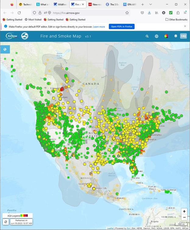 As a critically important issue for health, the EPA carefully monitors the national air quality. State-of-the-art monitors approved by EPA to monitor particulate concentrations for compliance with national air quality standards can cost $10,000 or more. Current air quality for specific locations can easily be obtained from the United States Environmental Protection Agency’s (EPA’s) Air Now website. On Friday, June 16, 2023, it looked like: