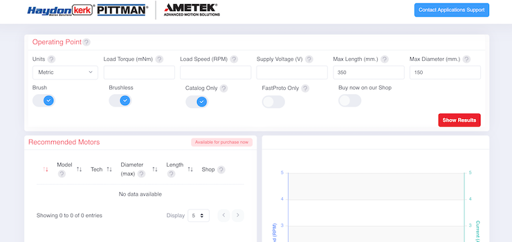 The Express tool lets users identify and select the right motor for their applications quickly and easily. When a user enters an ideal load point, torque, and speed, the Express tool returns a list of Pittman brushed and brushless dc motors that fit these specifications. Once the user selects a specific motor to explore, additional details — including performance curves and other relevant data — are available. Pittman Express then provides a direct link to Haydon Kerk Pittman’s e-commerce site to make a purchase.
