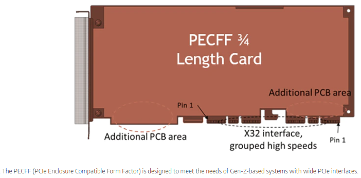 PCIe Enclosure Compatible Form Factor,或PECFF,是由z世代成员开发的机械外形因数,以降低解决方案的成本和复杂性。一些较新的服务器现在使用PECFF和相关的内部双轴Inter-Card SFF TA 1002电缆。