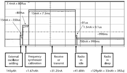在电池供电的无线传感节点中,最大的能源消耗通常是射频发射机。收发器在激活、等待甚至休眠模式下都应该具有极低的功率。传输周期各个部分的一秒电流消耗快照显示,7.5 ms接收或发射部分的电流消耗为15 mA,而处于睡眠模式的无线电为700 nA,占33-nAh (392-μJ)总能量消耗的90%以上。这只是最小化传输或接收传感器数据的电流的一个例子。