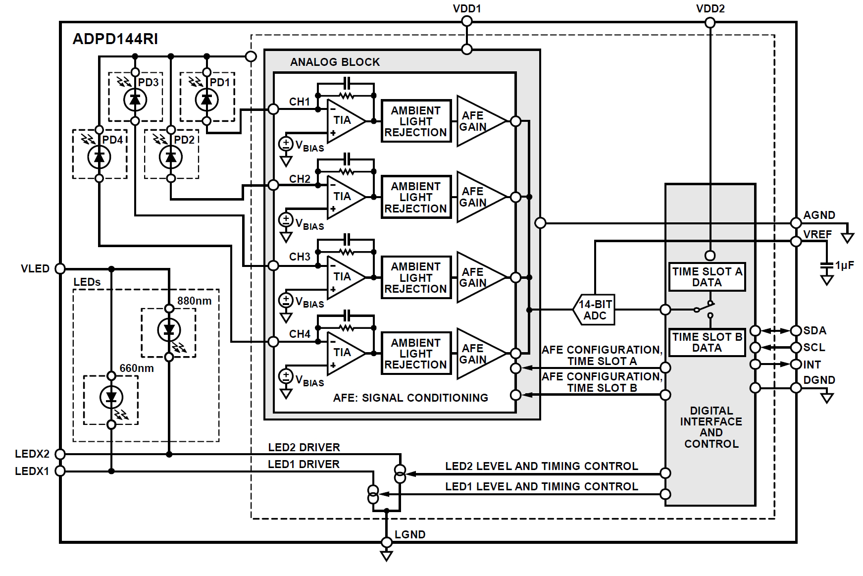 传感器分三个阶段操作红LED脉冲并测量回信接下去,IRLED脉冲并测量回信归根结底,后台信号均用LED关闭排除外部光源干扰感知函数分割成四大光片区段,视设计需求而定,可复用二或四道光通道连接到模拟信号处理块(视设计需求而定)(二或四道光通道连接到模拟信号处理块)(图3)