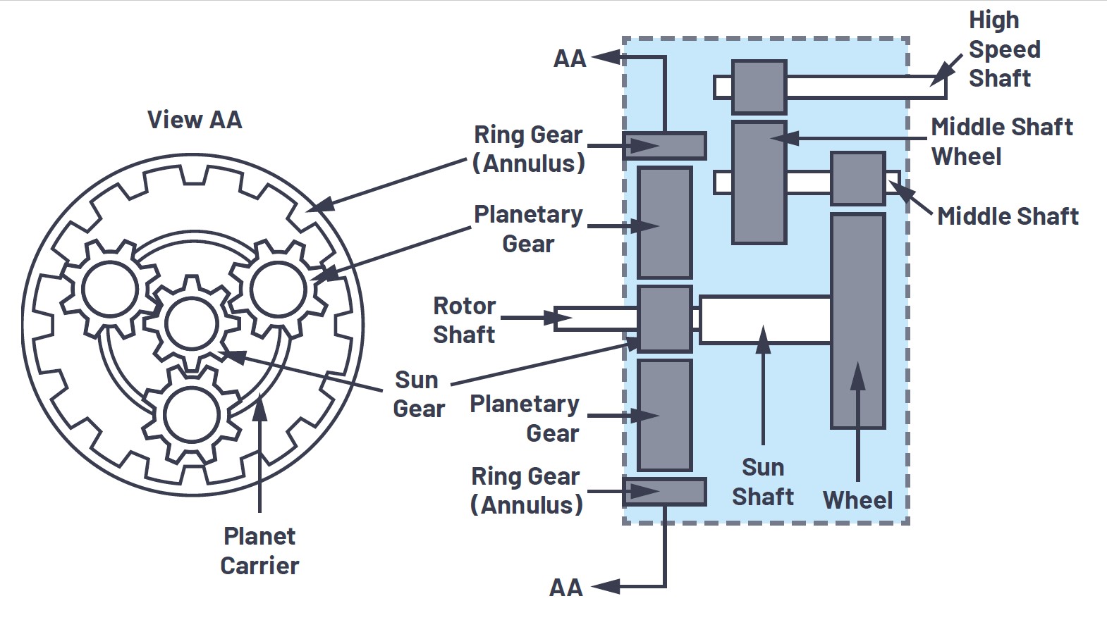 齿轮箱、转子叶片和发电机的故障率是所有风力涡轮机部件中最高的,而齿轮箱是最糟糕的。齿轮箱受到很大的机械应力,来自风速和制动的变化,以及从低速(20转或更低)旋转的转子毂传递机械能到高速(3200转)的发电机的应力。(图2).
