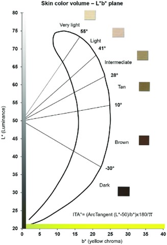 对应肤色的ITA可根据公式由L*和b*值得到。色块表示与L 'Oréal肤色表相匹配的每个颜色组的平均肤色。虽然L 'Oréal是一家化妆品公司,但它开发了这张图表,以便更深入地了解对抗衰老和阳光伤害的生物机制。