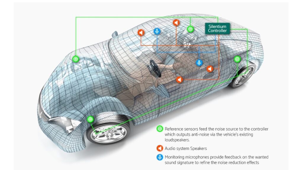 主动噪声注销过程从麦克风开始,这些麦克风战略定位在车辆内监测声位和频率,这些声位和频率通过空气和车辆结构传递数字信号处理器取信息并生成新信号并逆相汽车讲演者播放新奇声音时,它与现有(测量式)声音交互并部分或全部取消声音,结果声音要么听不进去,要么令乘客听不见或听不见