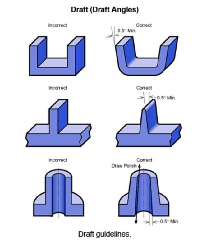 起草很重要,因为在大多数情况下,您不希望任何零件表面与模具上的抽签线完全90度。否则,您可能会损坏零件,例如阻力标记,这使得很难从模具中取出零件。