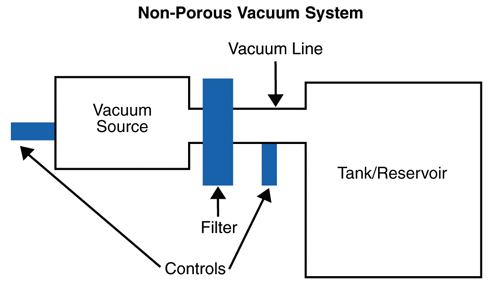 The first type of vacuum system is non-porous. Designing this system is straightforward. There are three basic considerations: volume, vacuum level and speed of evacuation. Other considerations include controls for signaling, energy saving devices, and filtration. An example of this type of application is a reservoir or vacuum tank.