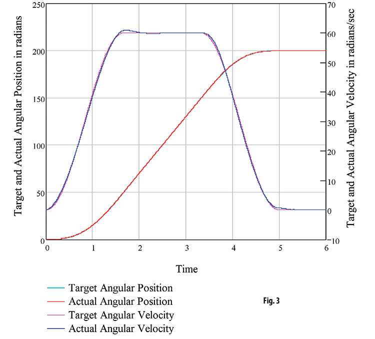 该图显示了作为模拟系统的时间的函数的角度位置和速度。因为实际位置和速度线位于目标位置和速度线的顶部,所以系统的设计和调谐良好。