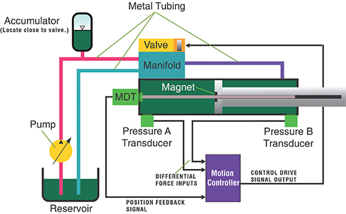 典型液压系统的示意图。系统组件的动态被建模为一阶微分方程,并用于系统仿真。