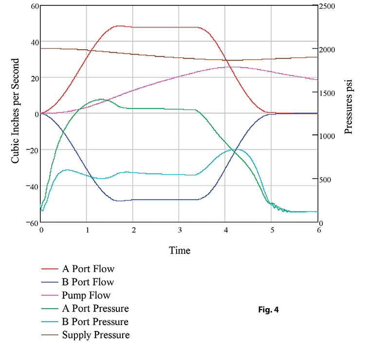 图4显示了模拟圆筒内发生的情况。流动和压力是绘制的。没有压力靠近供应压力或大气压,因此运动应该是正常的。随着供应压力下降,泵流量增加。这反映了泵对压降的反应。系统中的蓄能器使压力变化太多或太快,为泵响应。其他流程是预期的。