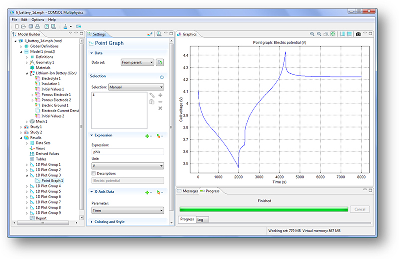 The new Batteries & Fuel Cells Module for COMSOL Multiphysics comes with predefined interfaces that speed up design studies. Here, the lithium-ion battery physics interface was used to simulate a battery’s discharge-recharge cycle.