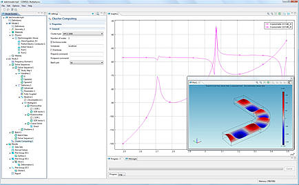 这个例子演示了一个由千兆以太网连接的小型计算集群求解h弯曲波导中的微波磁场。模拟扫描分布在集群节点上的100多个不同的频率。