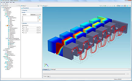 Comsol桌面GUI帮助您控制建模过程。该模型包括扩散、流体流动和传热的耦合。表面图显示了物种浓度。