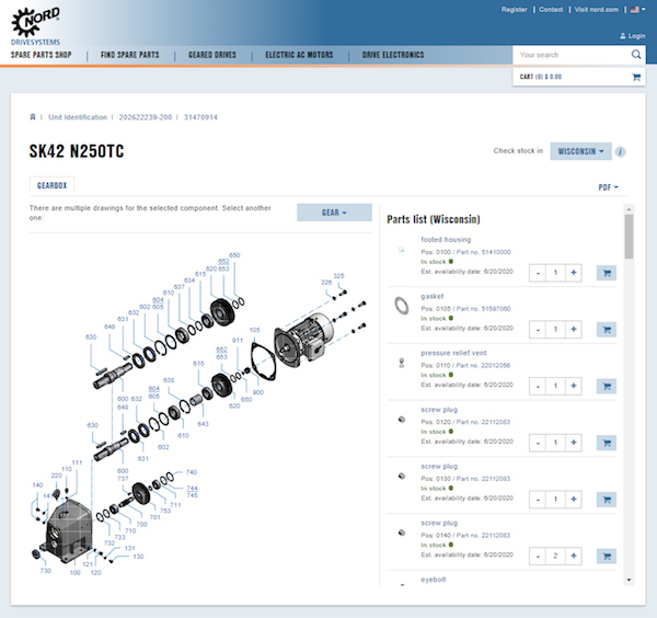 With the Spare Parts Shop, customers can easily find parts matching their NORD DRIVESYSTEMS unit by entering the serial, order, or existing part number, then selecting the required parts via the unit’s interactive parts diagrams. A convenient “share via email” function allows designated colleagues or customers to receive an email that includes a PDF of the appropriate diagrams, a complete bill of material, current availability, and a direct link back to the interactive diagram within the shop. Additionally, items in the cart can be downloaded as a PDF to serve as a simple quote document.