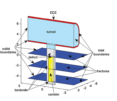 VTT的Veli-Matti Pulkkanen在整个膨润土和周围的岩石上产生了3D模型,包括裂缝,切割通过它的假设泄漏来自罐中的放射性核素的泄漏。当隧道和孔被挖掘出来时,围绕它们的薄层可以被称为挖掘损坏区(EDZ)损坏,水更容易流过这种挖掘引起的小孔和骨折。流体可以更容易地流入EDZ而不是通过原始隧道流动。