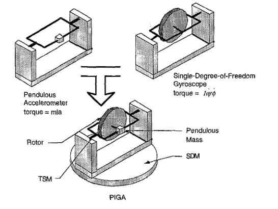 While this explanation is accurate and has the needed equations, it may not be intuitive even to someone with adequate background in physics. Another way to understand the PIGA’s operation is this: the sensing element of a PIGA is a pendulous mass which is free to pivot by being mounted on a bearing. A spinning gyroscope is attached such that it would restrain the pendulum against “falling” in the direction of acceleration. The pendulous mass and its attached gyroscope are themselves mounted on a pedestal that can be rotated by an electric torque motor. The rotational axis of this pedestal is mutually orthogonal to the spin axis of the gyroscope as well as the axis that the pendulum is free to move in. The axis of rotation of this pedestal is also in the direction of the measured acceleration.