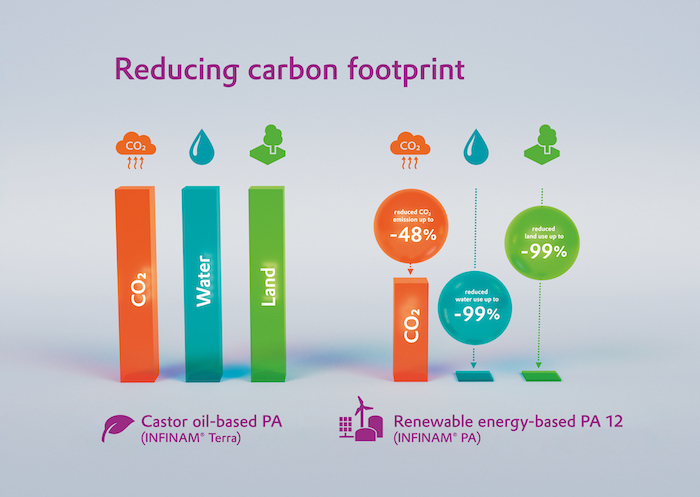 新的可持续INFINAM PA12粉末是在Marl化工园区使用可再生能源生产的。TÜV莱茵认证了相关的生命周期评估,证明该公司自身的碳足迹改善了近50%。在整个生命周期的评估中,新的可持续材料等级的比较是积极的,甚至与赢创自己的Terra系列蓖麻油为基础的聚酰胺相比。