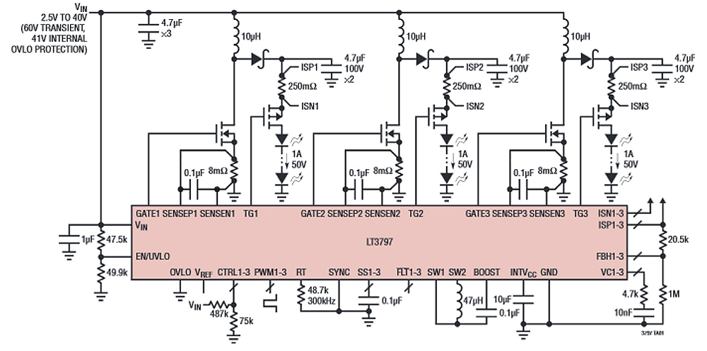 另一个LED驱动器IC是LT3797,一个多拓扑三输出LED驱动器。它有一个集成的轨对轨电流检测放大器,输出电压范围为0至100 V。它的三个通道中的每一个都可以配置为buck、boost或SEPIC操作模式,并且每个输出可以相互独立地操作。