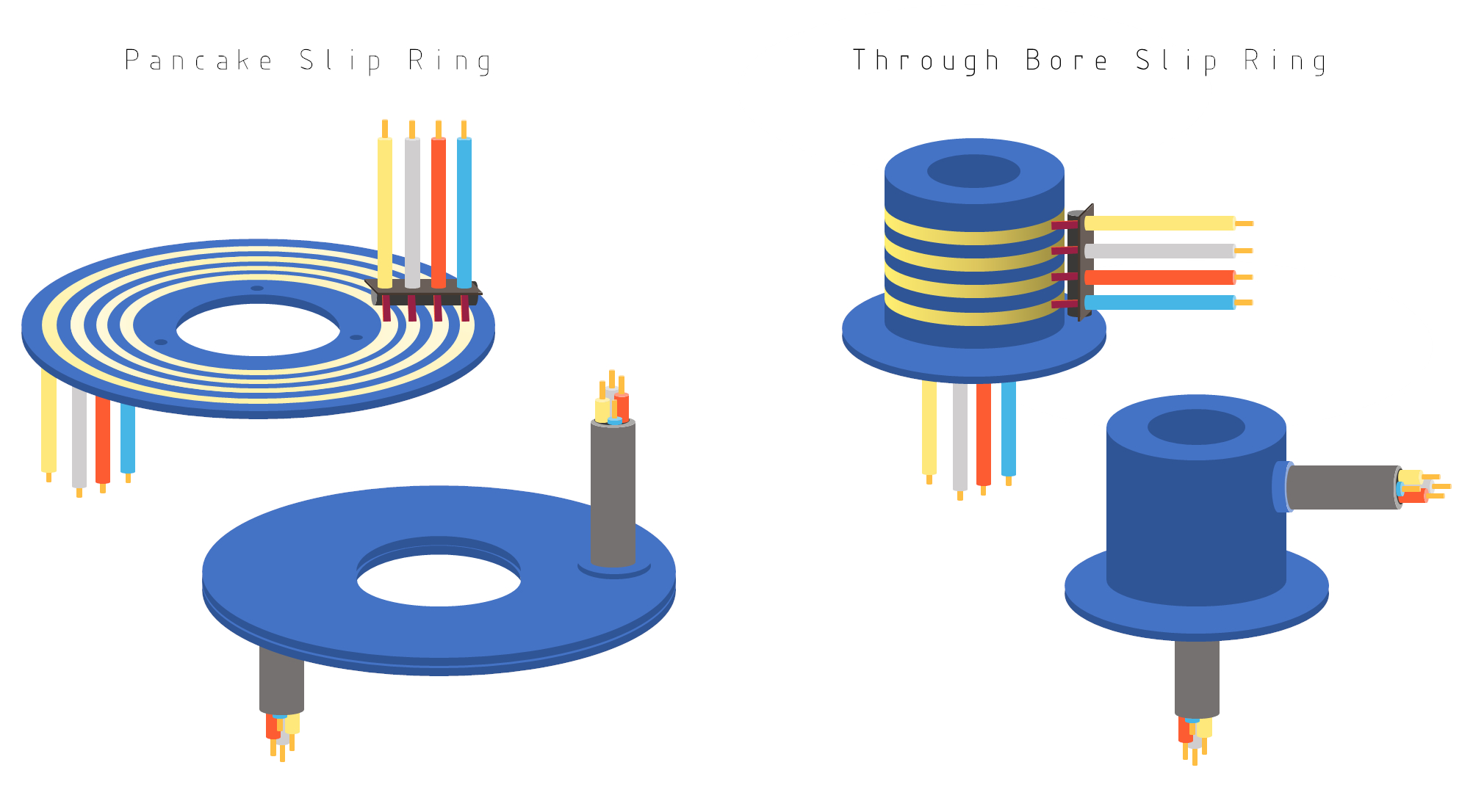 Slip rings are also called rotary joints, rotary electrical interfaces, rotating connectors, collectors, and swivels. They are available in various geometries and constructions, like a pancake and through bore designs(Figure 1).