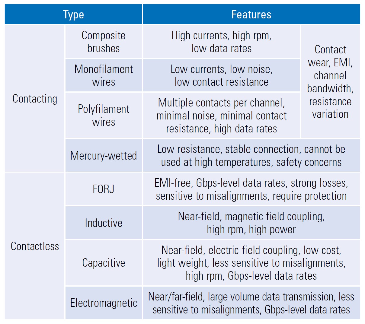 Inductive slip rings use electromagnetic induction and are suited to different applications. Like capacitive slip rings, inductive designs are suited for industrial applications with high rotation speeds. In contrast with capacitive slip rings, inductive slip rings are better suited for power transmission rather than data transmission. The blade pitch control systems in wind turbines are a common use of inductive slip rings. As shown, there are a variety of common slip ring technologies, each with a particular set of performance tradeoffs(Table 1).