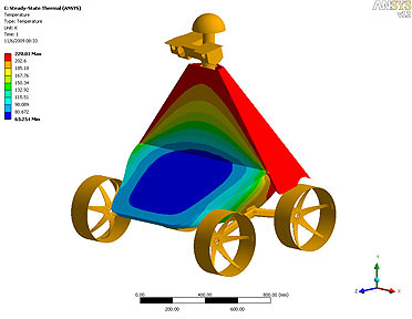 ANSYS有限元分析软件对Astrobotic Technology公司的机器人在静态结构载荷(顶部)和稳态热载荷(底部)条件下进行了仿真。礼貌,Ansys。