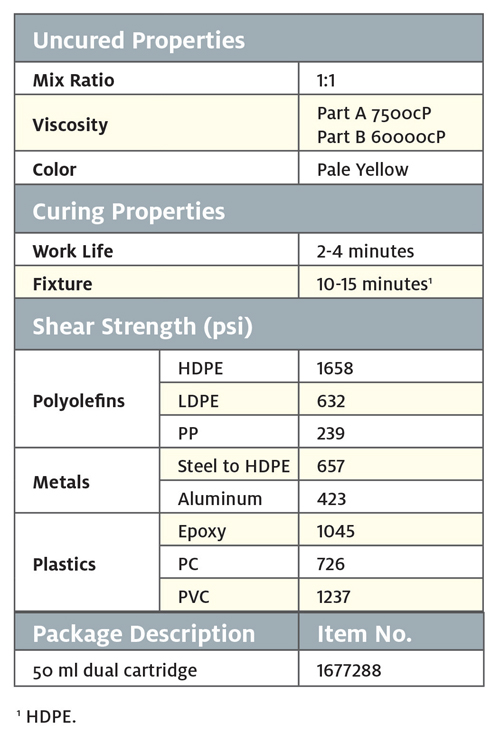 这种粘合剂,乐泰3035聚烯烃粘合剂,是一种由两部分组成的结构丙烯酸,可在HDPE, LDPE, UHMWPE, PP, ABS,尼龙,聚碳酸酯,PVC,环氧树脂,钢和铝上实现优异的粘结强度。