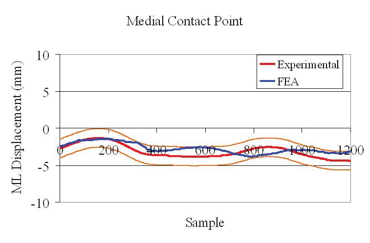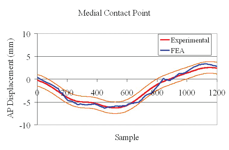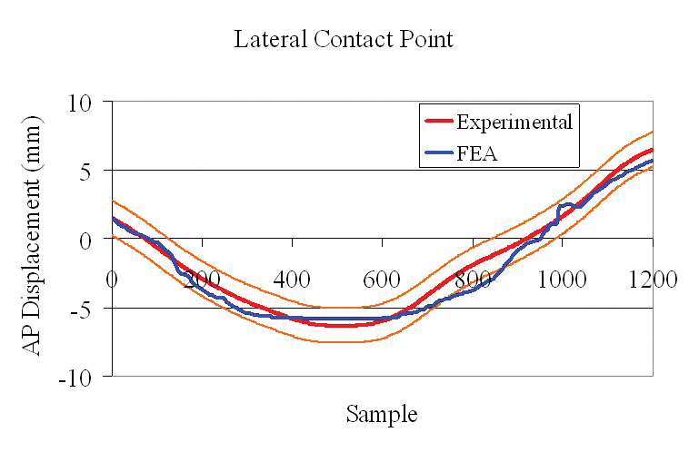 通过同样的运动将FEA模型放在患者中,因为患者允许股骨和胫骨部件之间的接触点,同时考虑到Videof荧光术未检测到的隐形聚乙烯部分的调节效果。FEA分析支持单独荧光检查的先前接触点位移测量,但具有更平滑,更可靠和一致的模式。