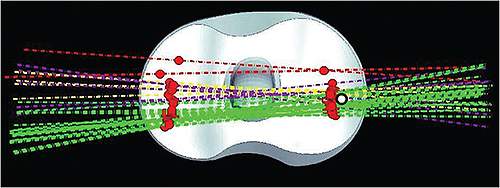 更换膝盖组件接触点的位置(红点)和接触线的旋转(中)
