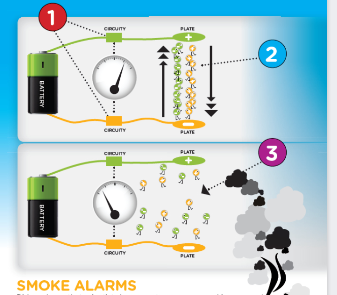 答:这种技术远没有那么直观。它使用少量安全屏蔽的放射性物质,使两个金属板之间的空气分子带电或电离(图2).这就在空气中产生了一个小电流,从一个极板流向另一个极板(2)。当烟雾或其他粒子进入室内时,它们会吸引这些离子并带走它们,从而减少电流。如果进入室内的粒子数量足够减少电流到一定数量(1)以下,设备将记录这些粒子为烟雾(3),并发出警报。