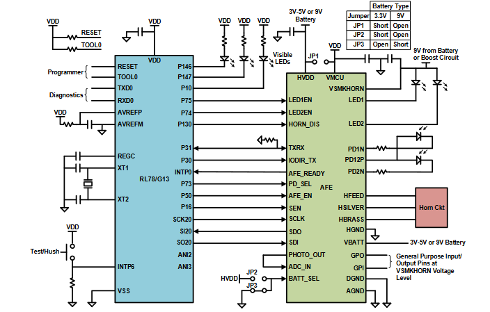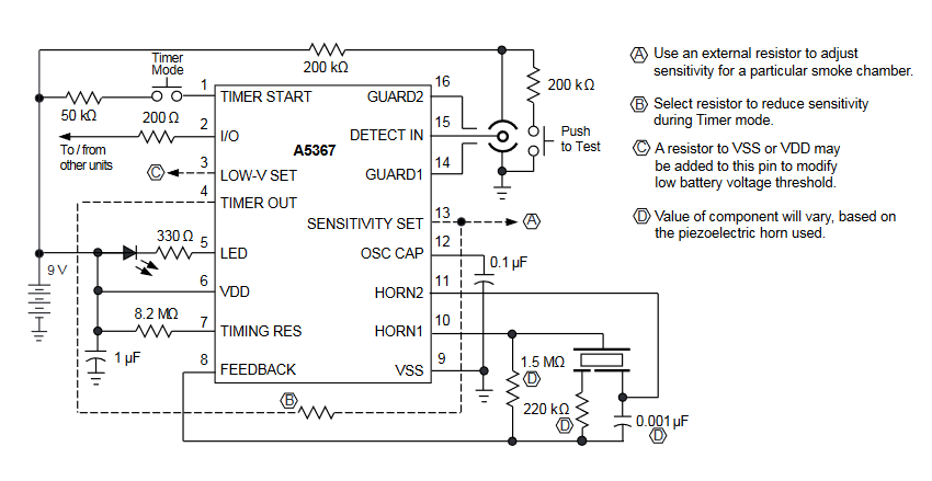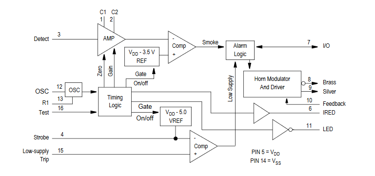 答:除了提供LED发射器和光传感器的基本管理外,烟雾探测器还必须驱动“喇叭”(压电声器),并向用户闪烁可见的LED指示灯。一些还可以连接到大功率频闪仪的驱动程序,用于听力受损的用户或设置,许多较新的也有I/O与其他单元通信(在第4部分详细介绍)。最后,它们必须有自检模式以及用户发起的自检模式(通过一个简单的按钮),以确保LED、光传感器和其他电路仍然有效。