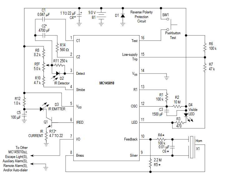 答:一种基本的烟雾探测器IC是NXP(飞思卡尔)的MC145010,这是一种16导通CMOS器件(图1).它的可变增益光电放大器可以直接与作为红外探测器的光电二极管连接。在待机状态下,低电源检测电路使用LED引脚的脉冲负载电流进行周期性检查。跳闸点是用两个外部电阻设定的。MC145010的电源可以是一个标准的9 v电池,因为它从6到12伏的电源运行,平均电源电流只有12 μA。