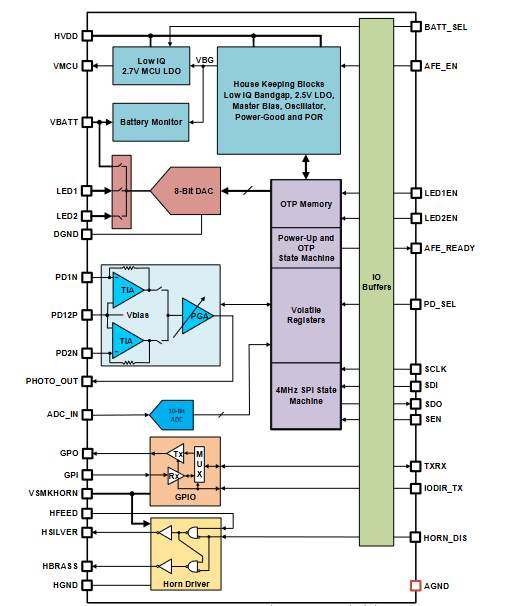 当与微控制器、光电发射器/探测器、喇叭和外部组件结合在一起时,就形成了一个完整的烟雾探测器(图4).该集成电路从3v到5v或从9v电池工作,并有一个内部LDO为微控制器提供电源。电池检测功能可以在电池电量不足时发出警报。