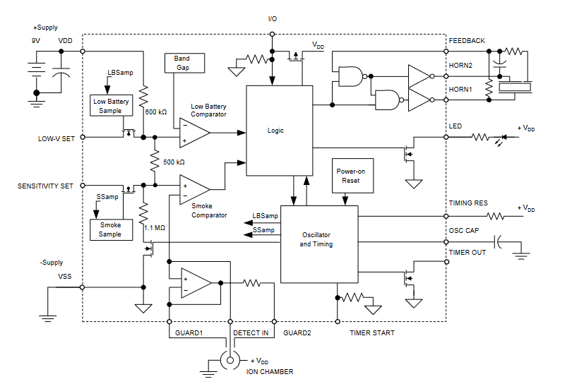 它包括一个压电式喇叭驱动器,检测器输入的电气“保护”输出(一种模拟电路技术),低电量脉冲测试,上电复位(POR),内部电池反向保护,定时器(静音)模式,以使灵敏度降低的周期,以及内置的滞后减少误触发。内部振荡器和定时电路通过关闭设备电源1.66秒和仅10毫秒的烟雾感应将待机功率保持在最低限度(图6).每24次开关循环,对低电量情况进行一次检查。