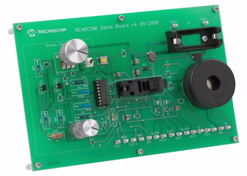 支持RE46C190所有功能的评估,提供设备的关键测试点。RE46C190应用电路位于板的右侧,由电池座和压电喇叭组成,而烟室模拟器位于板的左侧。仿真器可以与应用电路断开连接,实际的烟室或其组件可以连接到演示板,以进行最终的设计评估阶段。演示板还支持设计者调整烟雾密度设置,低电池测试,和其他功能。