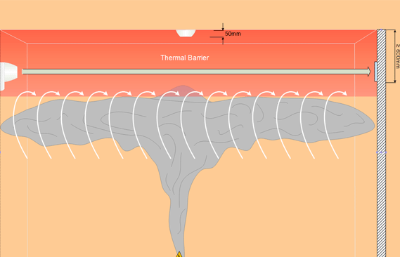 答:这种大跨度系统的一个问题是分层问题,即在天花板附近形成独立的空气层和热障(图3).因此,有可能使下面的含烟空气无法达到系统光束所经过的层。为了克服这种分层的问题,可以采用上下交错的方式使用两个或多个倾斜的横梁,每个横梁在天花板上呈30度角。
