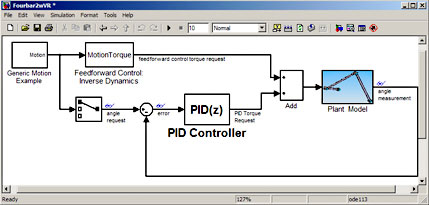 PID控制器取其中一个连杆的期望和实际旋转角度之间的误差信号,并创建一个转矩请求。这个请求被添加到前馈控制器的转矩请求中,并且这个和信号被用来驱动直流电机,驱动连接连杆的关节旋转。控制器必须使装置的运行稳定下来。它还必须最小化系统中的响应时间和超调量。由于控制器将在16位定点处理器上实现,因此它需要采用离散时间形式,增益和计算信号必须相应地缩放。