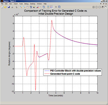 图4:仿真结果比较了所生成的C代码的性能与双精度PID控制器块的性能。