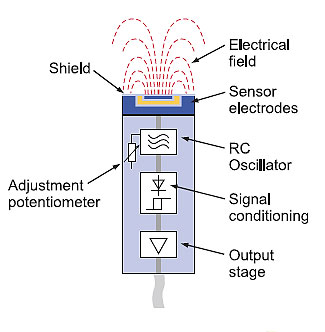 典型的电容式传感器结构显示两个板:一个板连接到振荡器(传感器电极),另一个板是被检测到的物体,在电场内检测到该物体.