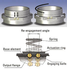 在弹簧张紧的扭矩限制器中,滚珠或滚子轴承精确地装载到加工成输出法兰的棘爪中,该输出法兰将在预定的扭矩水平上快速且准确地断开。根据尺寸考虑和轴的旋转速度,这种类型的扭矩限制器将在过载过程中和过载后棘轮或自由轮。