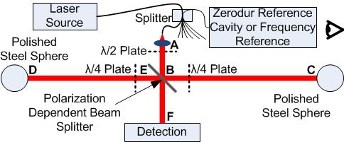 下图显示了干涉仪安排ment which allows an absolute distance measurement between steel spheres. It uses a fiber channeled laser source which can be shared between many individual distance measurements. The laser passes through a number of wave plates, changing its polarization plane and therefore allowing a polarization-dependent beam splitter to either reflect or pass the beam, depending on where it is in its path. The measurement beam, therefore, goes from the splitter to a collimating lens A, it then reflects off the beam splitter at B, reflects off the first sphere C, passes through the beam splitter, reflects off the second sphere D, reflects off the beam splitter at E and finally hits the detector at F. At the same time, a reference beam goes straight from A to F.