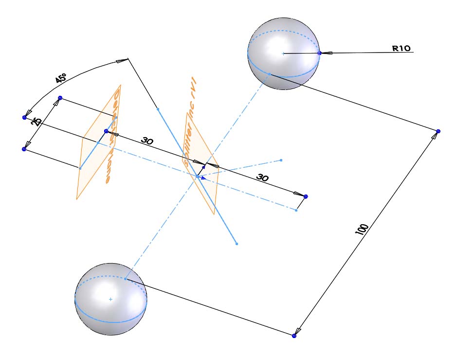 Once the direction vector was established with a 2D sketch on the reflection plane, a 3D sketch was then used to find the actual path BC, ending at point C on the surface of the first sphere. The 3D sketch contains a single line with one endpoint coincident with B and collinear with the direction vector just created. The final unconstrained endpoint of the 3D sketch is coincident with the surface of the first sphere, determining the point of intersection between the ray and the sphere.