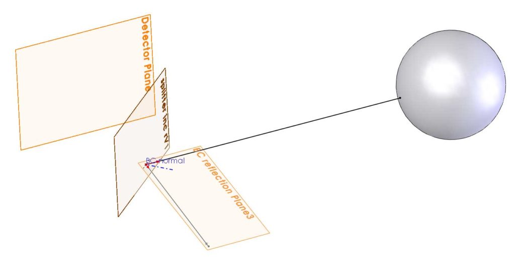 The reflection was then simulated as for the previous reflection. The plane of reflection was fully defined as coincident with the surface normal vector and the point at the other end of the incoming ray, B. The direction of CD was then found using a 2D sketch on the reflection plane, with a line that is symmetric to the incoming ray, about a centerline on the surface normal vector. Finally, a 3D sketch containing a single line was used to find the actual path CD with the point D coincident with the surface of the second sphere.
